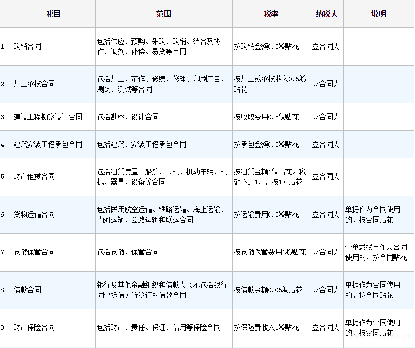 納稅申報(bào)的前提就是要計(jì)算應(yīng)納稅額,但是,相關(guān)的計(jì)稅稅率,又是需要小伙伴進(jìn)行掌握的。大家知道印花稅的稅率有哪些嗎?現(xiàn)行的印花稅稅率是多少呢?最新印花稅的稅率匯總表(全),小編整理好了,供大家在處理稅務(wù)申報(bào)時(shí),做個(gè)參考! 印花稅的稅率 印花稅的稅率有“比例稅率”和“定額稅率”。(1)比例稅率:①經(jīng)濟(jì)合同;②產(chǎn)權(quán)轉(zhuǎn)移書(shū)據(jù);③營(yíng)業(yè)賬簿內(nèi)中記載資金的賬簿(實(shí)收資本+資本公積)。(2)定額稅率:①權(quán)利許可證照;②營(yíng)業(yè)賬簿中的其他賬簿(日記賬和各種明細(xì)容賬等)。 印花稅稅率規(guī)定: 1、購(gòu)銷(xiāo)合同:按購(gòu)銷(xiāo)金額萬(wàn)分之三貼花; 2、加工承攬合同:按加工或承攬收入萬(wàn)分五貼花; 3、建設(shè)工程勘察設(shè)計(jì)合同:按收取費(fèi)用萬(wàn)分之五貼花; 4、建筑安裝工程承包合同:按承包金額萬(wàn)分之三貼花; 5、財(cái)產(chǎn)租賃合同:按租賃金額千分之一貼花;稅額不足一元的按一元貼花; 6、貨物運(yùn)輸合同:按運(yùn)輸費(fèi)用萬(wàn)分之五貼花;單據(jù)作為合同使用的,按合同貼花; 7、倉(cāng)儲(chǔ)保管合同: 按倉(cāng)儲(chǔ)保管費(fèi)用千分之一貼花;倉(cāng)單或棧單作為合同使用的,按合同貼花; 8、借款合同:按借款金額萬(wàn)分之零點(diǎn)五貼花,單據(jù)作為合同使用的,按合同貼花; 9、 財(cái)產(chǎn)保險(xiǎn)合同:按保費(fèi)收入千分之一貼花;單據(jù)作為合同使用的,按合同貼花; 10、技術(shù)合同:按所載金額萬(wàn)分之三貼花; 11、產(chǎn)權(quán)轉(zhuǎn)移書(shū)據(jù):按所載金額萬(wàn)分之五貼花; 12、營(yíng)業(yè)帳簿:(1)記載資金的賬簿按“實(shí)收資本”和“資本公積”兩賬戶的所記載的金額萬(wàn)分之五貼花 ;(2)其他賬簿按件5元貼花; 13、權(quán)利、許可證照:包括政府部門(mén)發(fā)給的房屋產(chǎn)權(quán)證、工商 營(yíng)業(yè)執(zhí)照、商標(biāo)注冊(cè)證、專利證、土地使用證按件貼花五元 。 印花稅稅目稅率表 以上是玖邀開(kāi)業(yè)網(wǎng)小編為您整理的關(guān)于最新印花稅的稅率匯總表的內(nèi)容,希望對(duì)您有所幫助。 |