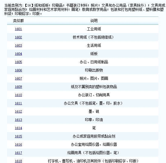 第16類商標(biāo)為辦公用品,適用于:紙和紙板;印刷品;書籍裝訂材料;照片;文具和辦公用品(家具除外);文具用或家庭用粘合劑;繪畫材料和藝術(shù)家用材料;畫筆;教育或教學(xué)用品;包裝和打包用塑料紙、塑料膜和塑料袋;印刷鉛字,印版。 第16類商標(biāo)查詢所含的小類別: 【1601】工業(yè)用紙 【1602】技術(shù)用紙(不包括絕緣紙) 【1603】生活用紙 【1604】紙板 【1605】辦公、日用紙制品 【1606】印刷出版物 【1607】照片,圖片,圖畫 【1609】紙及不屬別類的塑料包裝物品 【1610】辦公裝訂、切削用具 【1611】辦公文具(不包括筆,墨,印,膠水) 【1612】墨,硯 【1613】印章,印油 【1614】筆 【1615】辦公或家庭用膠帶或粘合劑 【1616】辦公室用繪圖儀器,繪畫儀器 【1617】繪畫用具(不包括繪圖儀器,筆) 【1618】打字機(jī)、謄寫機(jī)、油印機(jī)及其附件(包括印刷鉛字、印版) 【1619】教學(xué)用具(不包括教學(xué)實(shí)驗(yàn)用儀器) 【1620】室內(nèi)模型物(不包括教學(xué)用模型標(biāo)本) 【1621】單一商品 |