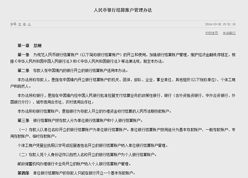 第一章 總則 為規(guī)范人民幣銀行結(jié)算賬戶(以下簡(jiǎn)稱銀行結(jié)算賬戶)的開(kāi)立和使用,加強(qiáng)銀行結(jié)算賬戶管理,維護(hù)經(jīng)濟(jì)金融秩序穩(wěn)定,根據(jù)《中華人民共和國(guó)中國(guó)人民銀行法》和《中華人民共和國(guó)銀行法》等法律法規(guī),制定本辦法。 第一條 第二條 存款人在中國(guó)境內(nèi)的銀行開(kāi)立的銀行結(jié)算賬戶適用本辦法。 本辦法所稱存款人,是指在中國(guó)境內(nèi)開(kāi)立銀行結(jié)算賬戶的機(jī)關(guān)、團(tuán)體、部隊(duì)、企業(yè)、事業(yè)單位、其他組織(以下統(tǒng)稱單位)、個(gè)體工商戶和自然人。 本辦法所稱銀行,是指在中國(guó)境內(nèi)經(jīng)中國(guó)人民銀行批準(zhǔn)經(jīng)營(yíng)支付結(jié)算業(yè)務(wù)的政策性銀行、銀行(含外資獨(dú)資銀行、中外合資銀行、外國(guó)銀行分行)、城市信用合作社、農(nóng)村信用合作社。 本辦法所稱銀行結(jié)算賬戶,是指銀行為存款人開(kāi)立的辦理資金收付結(jié)算的人民幣活期存款賬戶。 第三條 銀行結(jié)算賬戶按存款人分為單位銀行結(jié)算賬戶和個(gè)人銀行結(jié)算賬戶。 (一)存款人以單位名稱開(kāi)立的銀行結(jié)算賬戶為單位銀行結(jié)算賬戶。單位銀行結(jié)算賬戶按用途分為基本存款賬戶、一般存款賬戶、專用存款賬戶、臨時(shí)存款賬戶。 個(gè)體工商戶憑營(yíng)業(yè)執(zhí)照以字號(hào)或經(jīng)營(yíng)者姓名開(kāi)立的銀行結(jié)算賬戶納入單位銀行結(jié)算賬戶管理。 (二)存款人憑個(gè)人身份證件以自然人名稱開(kāi)立的銀行結(jié)算賬戶為個(gè)人銀行結(jié)算賬戶。 郵政儲(chǔ)蓄機(jī)構(gòu)辦理銀行卡業(yè)務(wù)開(kāi)立的賬戶納入個(gè)人銀行結(jié)算賬戶管理。 第四條 單位銀行結(jié)算賬戶的存款人只能在銀行開(kāi)立一個(gè)基本存款賬戶。 第五條 存款人應(yīng)在注冊(cè)地或住所地開(kāi)立銀行結(jié)算賬戶。符合本辦法規(guī)定可以在異地(跨省、市、縣)開(kāi)立銀行結(jié)算賬戶的除外。 第六條 存款人開(kāi)立基本存款賬戶、臨時(shí)存款賬戶和預(yù)算單位開(kāi)立專用存款賬戶實(shí)行核準(zhǔn)制度,經(jīng)中國(guó)人民銀行核準(zhǔn)后由開(kāi)戶銀行核發(fā)開(kāi)戶登記證。但存款人因注冊(cè)驗(yàn)資需要開(kāi)立的臨時(shí)存款賬戶除外。 第七條 存款人可以自主選擇銀行開(kāi)立銀行結(jié)算賬戶。除國(guó)家法律、行政法規(guī)和國(guó)務(wù)院規(guī)定外,任何單位和個(gè)人不得強(qiáng)令存款人到指定銀行開(kāi)立銀行結(jié)算賬戶。 第八條 銀行結(jié)算賬戶的開(kāi)立和使用應(yīng)當(dāng)遵守法律、行政法規(guī),不得利用銀行結(jié)算賬戶進(jìn)行偷逃稅款、逃廢債務(wù)、套取現(xiàn)金及其他違法犯罪活動(dòng)。 第九條 銀行應(yīng)依法為存款人的銀行結(jié)算賬戶信息保密。對(duì)單位銀行結(jié)算賬戶的存款和有關(guān)資料,除國(guó)家法律、行政法規(guī)另有規(guī)定外,銀行有權(quán)拒絕任何單位或個(gè)人查詢。對(duì)個(gè)人銀行結(jié)算賬戶的存款和有關(guān)資料,除國(guó)家法律另有規(guī)定外,銀行有權(quán)拒絕任何單位或個(gè)人查詢。 第十條 中國(guó)人民銀行是銀行結(jié)算賬戶的監(jiān)督管理部門(mén)。 第二章 銀行結(jié)算賬戶的開(kāi)立 基本存款賬戶是存款人因辦理日常轉(zhuǎn)賬結(jié)算和現(xiàn)金收付需要開(kāi)立的銀行結(jié)算賬戶。下列存款人,可以申請(qǐng)開(kāi)立基本存款賬戶: 第十一條 (一)企業(yè)法人。 (二)非法人企業(yè)。 (三)機(jī)關(guān)、事業(yè)單位。 (四)團(tuán)級(jí)(含)以上軍隊(duì)、武警部隊(duì)及分散執(zhí)勤的支(分)隊(duì)。 (五)社會(huì)團(tuán)體。 (六)民辦非企業(yè)組織。 (七)異地常設(shè)機(jī)構(gòu)。 (八)外國(guó)駐華機(jī)構(gòu)。 (九)個(gè)體工商戶。 (十)居民委員會(huì)、村民委員會(huì)、社區(qū)委員會(huì)。 (十一)單位設(shè)立的獨(dú)立核算的附屬機(jī)構(gòu)。 (十二)其他組織。 第十二條 一般存款賬戶是存款人因借款或其他結(jié)算需要,在基本存款賬戶開(kāi)戶銀行以外的銀行營(yíng)業(yè)機(jī)構(gòu)開(kāi)立的銀行結(jié)算賬戶。 第十三條 專用存款賬戶是存款人按照法律、行政法規(guī)和規(guī)章,對(duì)其特定用途資金進(jìn)行專項(xiàng)管理和使用而開(kāi)立的銀行結(jié)算賬戶。對(duì)下列資金的管理與使用,存款人可以申請(qǐng)開(kāi)立專用存款賬戶: (一)基本建設(shè)資金。 (二)更新改造資金。 (三)財(cái)政預(yù)算外資金。 (四)糧、棉、油收購(gòu)資金。 (五)證券交易結(jié)算資金。 (六)期貨交易保證金。 (七)信托基金。 (八)金融機(jī)構(gòu)存放同業(yè)資金。 (九)政策性房地產(chǎn)開(kāi)發(fā)資金。 (十)單位銀行卡備用金。 (十一)住房基金。 (十二)社會(huì)保障基金。 (十三)收入?yún)R繳資金和業(yè)務(wù)支出資金。 (十四)黨、團(tuán)、工會(huì)設(shè)在單位的組織機(jī)構(gòu)經(jīng)費(fèi)。 (十五)其他需要專項(xiàng)管理和使用的資金。 收入?yún)R繳資金和業(yè)務(wù)支出資金,是指基本存款賬戶存款人附屬的非獨(dú)立核算單位或派出