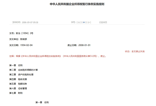 第一條 中華人民共和國境內(nèi)的企業(yè),除外商投資企業(yè)和外國企業(yè)外,應(yīng)當(dāng)就其生產(chǎn)、經(jīng)營所得和其他所得,依照本條例繳納企業(yè)所得稅。 企業(yè)的生產(chǎn)、經(jīng)營所得和其他所得,包括來源于中國境內(nèi)、境外的所得。 第二條 下列實行獨立經(jīng)濟核算的企業(yè)或者組織,為企業(yè)所得稅的納稅義務(wù)人(以下簡稱納稅人): (一)國有企業(yè); (二)集體企業(yè); (三)私營企業(yè); (四)聯(lián)營企業(yè); (五)股份制企業(yè); (六)有生產(chǎn)、經(jīng)營所得和其他所得的其他組織。 第三條 納稅人應(yīng)納稅額,按應(yīng)納稅所得額計算,稅率為33%。 第四條 納稅人每一納稅年度的收入總額減去準(zhǔn)予扣除項目后的余額為應(yīng)納稅所得額。 第五條 納稅人的收入總額包括: (一)生產(chǎn)、經(jīng)營收入; (二)財產(chǎn)轉(zhuǎn)讓收入; (三)利息收入; (四)租賃收入; (五)特許權(quán)使用費收入; (六)股息收入; (七)其他收入。 第六條 計算應(yīng)納稅所得額時準(zhǔn)予扣除的項目,是指與納稅人取得收入有關(guān)的成本、費用和損失。 下列項目,按照規(guī)定的范圍、標(biāo)準(zhǔn)扣除: (一)納稅人在生產(chǎn)、經(jīng)營期間,向金融機構(gòu)借款的利息支出,按照實際發(fā)生數(shù)扣除;向非金融機構(gòu)借款的利息支出,不高于按照金融機構(gòu)同類、同期貸款利率計算的數(shù)額以內(nèi)的部分,準(zhǔn)予扣除。 (二)納稅人支付給職工的工資,按照計稅工資扣除。計稅工資的具體標(biāo)準(zhǔn),在財政部規(guī)定的范圍內(nèi),由省、自治區(qū)、直轄市人民政府規(guī)定,報財政部備案。 (三)納稅人的職工工會經(jīng)費、職工福利費、職工教育經(jīng)費,分別按照計稅工資總額的2%、14%、1.5%計算扣除。 (四)納稅人用于公益、救濟性的捐贈,在年度應(yīng)納稅所得額3%以內(nèi)的部分,準(zhǔn)予扣除。 除本條第二款規(guī)定外,其他項目,依照法律、行政法規(guī)和國家有關(guān)稅收的規(guī)定扣除。 第七條 在計算應(yīng)納稅所得額時,下列項目不得扣除: (一)資本性支出; (二)無形資產(chǎn)受讓、開發(fā)支出; (三)違法經(jīng)營的罰款和被沒收財物的損失; (四)各項稅收的滯納金、罰金和罰款; (五)自然災(zāi)害或者意外事故損失有賠償?shù)牟糠郑?/div> (六)超過國家規(guī)定允許扣除的公益、救濟性捐贈,以及非公益、救濟性的捐贈; (七)各種贊助支出; (八)與取得收入無關(guān)的其他各項支出。 第八條 對下列納稅人,實行稅收優(yōu)惠政策: (一)民族自治地方的企業(yè),需要照顧和鼓勵的,經(jīng)省級人民政府批準(zhǔn),可以實行定期減稅或者免稅; (二)法律、行政法規(guī)和國務(wù)院有關(guān)規(guī)定給予減稅或者免稅的企業(yè),依照規(guī)定執(zhí)行。 第九條 納稅人在計算應(yīng)納稅所得額時,其財務(wù)、會計處理辦法同國家有關(guān)稅收的規(guī)定有抵觸的,應(yīng)當(dāng)依照國家有關(guān)稅收的規(guī)定計算納稅。 第十條 納稅人與其關(guān)聯(lián)企業(yè)之間的業(yè)務(wù)往來,應(yīng)當(dāng)按照獨立企業(yè)之間的業(yè)務(wù)往來收取或者支付價款、費用。不按照獨立企業(yè)之間的業(yè)務(wù)往來收取或者支付價款、費用,而減少其應(yīng)納稅所得額的,稅務(wù)機關(guān)有權(quán)進(jìn)行合理調(diào)整。 第十一條 納稅人發(fā)生年度虧損的,可以用下一納稅年度的所得彌補;下一納稅年度的所得不足彌補的,可以逐年延續(xù)彌補,但是延續(xù)彌補期最長不得超過五年。 第十二條 納稅人來源于中國境外的所得,已在境外繳納的所得稅稅款,準(zhǔn)予在匯總納稅時,從其應(yīng)納稅額中扣除,但是扣除額不得超過其境外所得依照本條例規(guī)定計算的應(yīng)納稅額。 第十三條 納稅人依法進(jìn)行清算時,其清算終了后的清算所得,應(yīng)當(dāng)依照本條例規(guī)定繳納企業(yè)所得稅。 第十四條 除國家另有規(guī)定外,企業(yè)所得稅由納稅人向其所在地主管稅務(wù)機關(guān)繳納。 第十五條 繳納企業(yè)所得稅,按年計算,分月或者分季預(yù)繳。月份或者季度終了后十五日內(nèi)預(yù)繳,年度終了后四個月內(nèi)匯算清繳,多退少補。 第十六條 納稅人應(yīng)當(dāng)在月份或者季度終了后十五日內(nèi),向其所在地主管稅務(wù)機關(guān)報送會計報表和預(yù)繳所得稅申報表;年度終了后四十五日內(nèi),向其所在地主管稅務(wù)機關(guān)報送會計決算報表和所得稅申報表。 第十七條 企業(yè)所得稅的征收管理,依照《中華人民共和國稅收征收管理法》及本條例有關(guān)規(guī)定執(zhí)行。 第十八條 金融、保險企業(yè)繳納企業(yè)所得稅,依照有關(guān)規(guī)定執(zhí)行。 第十九條 本條例由財政部負(fù)責(zé)解釋,實施細(xì)則由財政部制定。 第二十條 本條例自一九九四年一月一日起施行。國務(wù)院一九八四年九月十八日發(fā)布的《中華人民共和國國營企業(yè)所得稅條例(草案)》和《國營企業(yè)調(diào)節(jié)稅征收辦法》、一九八五年四月十一日發(fā)布的《中華人民共和國集體企業(yè)所得稅暫行條例》、一九八八年六月二十五日發(fā)布的《中華人民共和國私營企業(yè)所得稅暫行條例》同時廢止;國務(wù)