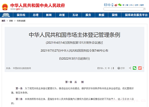 中華人民共和國(guó)市場(chǎng)主體登記管理?xiàng)l例 第一章 總 則 第一條 為了規(guī)范市場(chǎng)主體登記管理行為,推進(jìn)法治化市場(chǎng)建設(shè),維護(hù)良好市場(chǎng)秩序和市場(chǎng)主體合法權(quán)益,優(yōu)化營(yíng)商環(huán)境,制定本條例。 第二條 本條例所稱市場(chǎng)主體,是指在中華人民共和國(guó)境內(nèi)以營(yíng)利為目的從事經(jīng)營(yíng)活動(dòng)的下列自然人、法人及非法人組織: (一)公司、非公司企業(yè)法人及其分支機(jī)構(gòu); (二)個(gè)人獨(dú)資企業(yè)、合伙企業(yè)及其分支機(jī)構(gòu); (三)農(nóng)民專業(yè)合作社(聯(lián)合社)及其分支機(jī)構(gòu); (四)個(gè)體工商戶; (五)外國(guó)公司分支機(jī)構(gòu); (六)法律、行政法規(guī)規(guī)定的其他市場(chǎng)主體。 第三條 市場(chǎng)主體應(yīng)當(dāng)依照本條例辦理登記。未經(jīng)登記,不得以市場(chǎng)主體名義從事經(jīng)營(yíng)活動(dòng)。法律、行政法規(guī)規(guī)定無(wú)需辦理登記的除外。 市場(chǎng)主體登記包括設(shè)立登記、變更登記和注銷登記。 第四條 市場(chǎng)主體登記管理應(yīng)當(dāng)遵循依法合規(guī)、規(guī)范統(tǒng)一、公開(kāi)透明、便捷高效的原則。 第五條 國(guó)務(wù)院市場(chǎng)監(jiān)督管理部門(mén)主管全國(guó)市場(chǎng)主體登記管理工作。 縣級(jí)以上地方人民政府市場(chǎng)監(jiān)督管理部門(mén)主管本轄區(qū)市場(chǎng)主體登記管理工作,加強(qiáng)統(tǒng)籌指導(dǎo)和監(jiān)督管理。 第六條 國(guó)務(wù)院市場(chǎng)監(jiān)督管理部門(mén)應(yīng)當(dāng)加強(qiáng)信息化建設(shè),制定統(tǒng)一的市場(chǎng)主體登記數(shù)據(jù)和系統(tǒng)建設(shè)規(guī)范。 縣級(jí)以上地方人民政府承擔(dān)市場(chǎng)主體登記工作的部門(mén)(以下稱登記機(jī)關(guān))應(yīng)當(dāng)優(yōu)化市場(chǎng)主體登記辦理流程,提高市場(chǎng)主體登記效率,推行當(dāng)場(chǎng)辦結(jié)、一次辦結(jié)、限時(shí)辦結(jié)等制度,實(shí)現(xiàn)集中辦理、就近辦理、網(wǎng)上辦理、異地可辦,提升市場(chǎng)主體登記便利化程度。 第七條 國(guó)務(wù)院市場(chǎng)監(jiān)督管理部門(mén)和國(guó)務(wù)院有關(guān)部門(mén)應(yīng)當(dāng)推動(dòng)市場(chǎng)主體登記信息與其他政府信息的共享和運(yùn)用,提升政府服務(wù)效能。 第二章 登記事項(xiàng) 第八條 市場(chǎng)主體的一般登記事項(xiàng)包括: (一)名稱; (二)主體類型; (三)經(jīng)營(yíng)范圍; (四)住所或者主要經(jīng)營(yíng)場(chǎng)所; (五)注冊(cè)資本或者出資額; (六)法定代表人、執(zhí)行事務(wù)合伙人或者負(fù)責(zé)人姓名。 除前款規(guī)定外,還應(yīng)當(dāng)根據(jù)市場(chǎng)主體類型登記下列事項(xiàng): (一)有限責(zé)任公司股東、股份有限公司發(fā)起人、非公司企業(yè)法人出資人的姓名或者名稱; (二)個(gè)人獨(dú)資企業(yè)的投資人姓名及居所; (三)合伙企業(yè)的合伙人名稱或者姓名、住所、承擔(dān)責(zé)任方式; (四)個(gè)體工商戶的經(jīng)營(yíng)者姓名、住所、經(jīng)營(yíng)場(chǎng)所; (五)法律、行政法規(guī)規(guī)定的其他事項(xiàng)。 第九條 市場(chǎng)主體的下列事項(xiàng)應(yīng)當(dāng)向登記機(jī)關(guān)辦理備案: (一)章程或者合伙協(xié)議; (二)經(jīng)營(yíng)期限或者合伙期限; (三)有限責(zé)任公司股東或者股份有限公司發(fā)起人認(rèn)繳的出資數(shù)額,合伙企業(yè)合伙人認(rèn)繳或者實(shí)際繳付的出資數(shù)額、繳付期限和出資方式; (四)公司董事、監(jiān)事、高級(jí)管理人員; (五)農(nóng)民專業(yè)合作社(聯(lián)合社)成員; (六)參加經(jīng)營(yíng)的個(gè)體工商戶家庭成員姓名; (七)市場(chǎng)主體登記聯(lián)絡(luò)員、外商投資企業(yè)法律文件送達(dá)接受人; (八)公司、合伙企業(yè)等市場(chǎng)主體受益所有人相關(guān)信息; (九)法律、行政法規(guī)規(guī)定的其他事項(xiàng)。 第十條 市場(chǎng)主體只能登記一個(gè)名稱,經(jīng)登記的市場(chǎng)主體名稱受法律保護(hù)。 市場(chǎng)主體名稱由申請(qǐng)人依法自主申報(bào)。 第十一條 市場(chǎng)主體只能登記一個(gè)住所或者主要經(jīng)營(yíng)場(chǎng)所。 電子商務(wù)平臺(tái)內(nèi)的自然人經(jīng)營(yíng)者可以根據(jù)國(guó)家有關(guān)規(guī)定,將電子商務(wù)平臺(tái)提供的網(wǎng)絡(luò)經(jīng)營(yíng)場(chǎng)所作為經(jīng)營(yíng)場(chǎng)所。 省、自治區(qū)、直轄市人民政府可以根據(jù)有關(guān)法律、行政法規(guī)的規(guī)定和本地區(qū)實(shí)際情況,自行或者授權(quán)下級(jí)人民政府對(duì)住所或者主要經(jīng)營(yíng)場(chǎng)所作出更加便利市場(chǎng)主體從事經(jīng)營(yíng)活動(dòng)的具體規(guī)定。 第十二條 有下列情形之一的,不得擔(dān)任公司、非公司企業(yè)法人的法定代表人: (一)無(wú)民事行為能力或者限制民事行為能力; (二)因貪污、賄賂、侵占財(cái)產(chǎn)、挪用財(cái)產(chǎn)或者破壞社會(huì)主義市場(chǎng)經(jīng)濟(jì)秩序被判處刑罰,執(zhí)行期滿未逾5年,或者因犯罪被剝奪政治權(quán)利,執(zhí)行期滿未逾5年; (三)擔(dān)任破產(ch