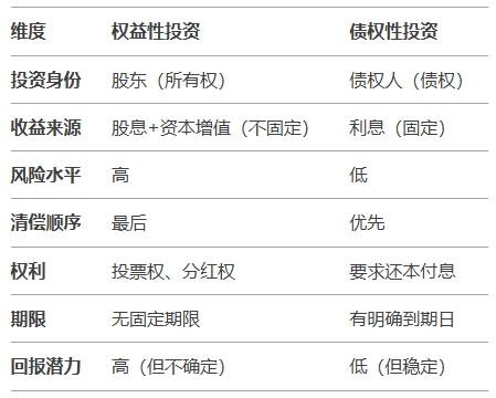 權(quán)益性投資和債權(quán)性投資是兩種不同的投資方式,核心區(qū)別在于投資者與融資方的關(guān)系、收益方式、風(fēng)險特征以及權(quán)利責(zé)任等。以下是兩者的主要區(qū)別: 1. 投資性質(zhì) - 權(quán)益性投資(如股票、股權(quán)): - 投資者通過購買股權(quán)(如股票)成為公司的股東,擁有公司部分所有權(quán)。 - 投資回報與公司經(jīng)營成果掛鉤,收益不固定,風(fēng)險較高。 - 債權(quán)性投資(如債券、貸款): - 投資者通過借款(如購買債券、提供貸款)成為公司的債權(quán)人,與公司形成債權(quán)債務(wù)關(guān)系。 - 投資回報為固定利息,收益相對穩(wěn)定,風(fēng)險較低。 2. 收益方式 - 權(quán)益性投資: - 股息/分紅:由公司利潤分配,不固定(可能無分紅)。 - 資本利得:通過股價上漲或股權(quán)增值獲利。 - 潛在高收益:若公司高速成長,回報可能遠(yuǎn)超債權(quán)投資。 - 債權(quán)性投資: - 固定利息:按約定利率定期收取利息(如債券票面利率)。 - 到期還本:本金在約定時間返還(除非債務(wù)人違約)。 - 收益有限:回報上限為合同約定的利息。 3. 風(fēng)險特征 - 權(quán)益性投資: - 高風(fēng)險:收益依賴公司盈利能力和市場波動,可能虧損本金(如股價下跌)。 - 清償順序靠后:若公司破產(chǎn),股東在債權(quán)人之后分配剩余資產(chǎn)。 - 債權(quán)性投資: - 低風(fēng)險:利息和本金償付優(yōu)先于股東權(quán)益(法律保障)。 - 違約風(fēng)險:主要風(fēng)險是債務(wù)人無法按時還本付息(信用風(fēng)險)。 4. 投資期限 - 權(quán)益性投資: - 通常無固定期限,投資者可通過二級市場(如股票市場)買賣退出。 - 債權(quán)性投資: - 有明確到期日(如1年、5年、10年期債券),到期后債權(quán)人收回本金。 5. 權(quán)利與責(zé)任 - 權(quán)益性投資: - 股東權(quán)利:參與公司決策(如投票權(quán))、分享利潤、監(jiān)督經(jīng)營。 - 有限責(zé)任:以出資額為限承擔(dān)公司虧損。 - 債權(quán)性投資: - 債權(quán)人權(quán)利:無公司決策權(quán),但有權(quán)要求債務(wù)人按時還本付息。 - 合同約束:可通過合同條款限制債務(wù)人行為(如限制負(fù)債率)。 6. 稅務(wù)處理 - 權(quán)益性投資: - 股息可能面臨雙重征稅(公司繳納所得稅后分配利潤,股東再繳個稅)。 - 債權(quán)性投資: - 利息支出通常作為公司財務(wù)費(fèi)用,可在稅前扣除(降低公司稅負(fù))。 7. 適用場景 - 權(quán)益性投資: - 適合追求長期資本增值、能承受高風(fēng)險的投資者(如風(fēng)險投資基金、股票投資者)。 - 企業(yè)通過股權(quán)融資可降低負(fù)債率,但需稀釋控制權(quán)。 - 債權(quán)性投資: - 適合保守型投資者或需要穩(wěn)定現(xiàn)金流的機(jī)構(gòu)(如債券基金、養(yǎng)老金)。 - 企業(yè)通過債權(quán)融資可保留控制權(quán),但需承擔(dān)還本付息壓力。 典型例子 - 權(quán)益性投資:購買上市公司股票、風(fēng)險投資(VC)、私募股權(quán)投資(PE)。 - 債權(quán)性投資:國債、企業(yè)債券、銀行貸款、應(yīng)收賬款融資。 |