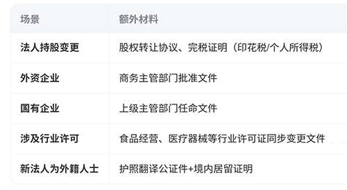 2025年上海企業(yè)法定代表人變更所需材料清單,綜合最新政策要求整理: 一、基礎(chǔ)必備材料 主體文件 《公司登記(備案)申請書》(法定代表人簽署并加蓋公章); 《指定代表或共同委托代理人授權(quán)委托書》(加蓋公章,附代辦人身份證復(fù)印件); 公司章程修正案(全體股東簽字+公章,明確法人變更條款); 法人身份文件; 新法定代表人身份證原件及正反面復(fù)印件(需加蓋“與原件一致”公章); 原法定代表人免職文件及新法定代表人任職文件(股東會/董事會決議); 執(zhí)照與公章; 營業(yè)執(zhí)照正副本原件; 公司公章(用于材料簽章); 二、特殊情形附加材料 三、關(guān)鍵注意事項 實名認(rèn)證要求 新舊法定代表人需通過“隨申辦”APP完成人臉核實名認(rèn)證,否則材料無效。; 文件簽署規(guī)范 股東會決議需全體股東簽字(自然人親筆簽名,非自然人加蓋公章); 線上提交需使用電子簽章(需提前辦理數(shù)字證書)。 后續(xù)同步事項 變更后3日內(nèi)需更新稅務(wù)登記,同步銀行賬戶、社保/公積金信息。 四、材料提交方式 線上辦理(推薦): 登錄上!耙痪W(wǎng)通辦”平臺,上傳材料后完成電子簽名。 線下辦理: 攜帶材料至注冊地市場監(jiān)管局窗口(浦東新區(qū)試點(diǎn)“跨區(qū)通辦”)。 提示:材料需真實有效,隱瞞債務(wù)或偽造簽名將面臨最高5萬元罰款。全流程約5-10工作日,浦東新區(qū)符合條件企業(yè)可1小時出照。 |