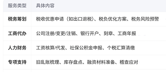 代理記賬公司的工作范圍可分為法定基礎(chǔ)服務(wù)和增值服務(wù)兩大類,具體如下: 一、法定基礎(chǔ)服務(wù)(必選內(nèi)容) 會計核算全流程 憑證處理:審核原始憑證真實(shí)性,填制記賬憑證 賬簿登記:登記總賬、明細(xì)賬、現(xiàn)金日記賬等會計賬簿 報表編制:按月/季編制資產(chǎn)負(fù)債表、利潤表、現(xiàn)金流量表 稅務(wù)合規(guī)服務(wù) 納稅申報(增值稅、企業(yè)所得稅、個稅等) 稅務(wù)登記/注銷、一般納稅人資格認(rèn)證 向稅務(wù)機(jī)關(guān)提供稅務(wù)資料,處理日常涉稅溝通 法定報告與存檔 編制對外財務(wù)報表(需企業(yè)負(fù)責(zé)人與代理機(jī)構(gòu)雙簽章) 整理裝訂會計憑證,保管會計檔案 二、增值服務(wù)(按需選擇) 三、關(guān)鍵注意事項(xiàng) 服務(wù)邊界 代理記賬不包含:審計報告出具(需會計師事務(wù)所)、財務(wù)戰(zhàn)略決策(需財務(wù)顧問) 違規(guī)操作紅線:拒絕處理虛開發(fā)票、個人賬戶收公款等違法要求 合同必備條款 明確票據(jù)量上限(例:超200張/月加收費(fèi)用)、是否含工商年報/匯算清繳 約定稽查響應(yīng)時效(如24小時內(nèi)提供資料) 技術(shù)能力差異 優(yōu)質(zhì)機(jī)構(gòu)提供:全電票自動采集、AI稅務(wù)風(fēng)險檢測(2025年新增服務(wù)) 基礎(chǔ)機(jī)構(gòu)僅支持:手工錄入發(fā)票、線下提交申報 最新趨勢:2025年起,頭部代理記賬公司已集成“政策機(jī)器人”,實(shí)時推送金稅四期規(guī)則變動,并支持區(qū)塊鏈財務(wù)數(shù)據(jù)存證。 |