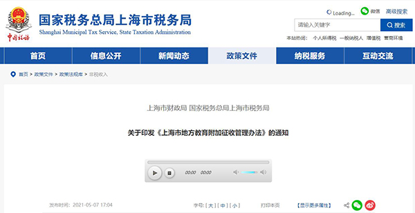 各區(qū)財政局、市財政監(jiān)督局,國家稅務(wù)總局上海市各區(qū)稅務(wù)局、各稅務(wù)分局、各稽查局: 根據(jù)《上海市人民政府關(guān)于本市繼續(xù)征收地方教育附加的通知》(滬府規(guī)〔2020〕35號)規(guī)定,為加強和規(guī)范地方教育附加的征收管理,我們制定了《上海市地方教育附加征收管理辦法》,現(xiàn)印發(fā)給你們,請按照執(zhí)行。 上海市財政局 國家稅務(wù)總局上海市稅務(wù)局 2021年4月28日 上海市地方教育附加征收管理辦法 第一條 為貫徹落實《中華人民共和國教育法》、《財政部關(guān)于同意上海市開征地方教育附加的復(fù)函》(財綜函〔2010〕78號)以及《上海市人民政府關(guān)于本市繼續(xù)征收地方教育附加的通知》(滬府規(guī)〔2020〕35號)有關(guān)精神,制定本辦法。 第二條 凡在本市行政區(qū)域內(nèi)繳納增值稅、消費稅的單位和個人(包括外商投資企業(yè)、外國企業(yè)及外籍個人),除按國家規(guī)定繳納教育費附加外,應(yīng)當按本辦法規(guī)定繳納地方教育附加。 第三條 地方教育附加以單位和個人實際繳納的增值稅、消費稅稅額為計征依據(jù),征收率為2%。地方教育附加的減免優(yōu)惠政策,按國家有關(guān)文件規(guī)定執(zhí)行。 第四條 地方教育附加由本市稅務(wù)部門負責征收,征收時應(yīng)使用稅務(wù)部門統(tǒng)一印制的稅收票證,并按國家和本市非稅收入收繳管理有關(guān)規(guī)定將收入及時、足額繳入市級國庫。 第五條 地方教育附加屬于政府性基金項目,納入財政預(yù)算,實行“收支兩條線”管理。 第六條 納稅人應(yīng)當在繳納增值稅、消費稅時一并繳納地方教育附加。單位繳納的地方教育附加,按照國家統(tǒng)一規(guī)定的會計制度處理。 第七條 各級財政、稅務(wù)、人力資源社會保障、教育、審計等部門要加強對地方教育附加的征收、解繳、使用的監(jiān)督管理和檢查。 第八條 凡未經(jīng)批準,擅自多征、減征、緩征、停征,或者侵占、截留、挪用地方教育附加的,要依照《財政違法行為處罰處分條例》(國務(wù)院令第427號)和《違反行政事業(yè)性收費和罰沒收入收支兩條線管理規(guī)定行政處分暫行規(guī)定》(國務(wù)院令第281號)追究責任人的行政責任;構(gòu)成犯罪的,依法追究刑事責任。 第九條 本辦法自2021年5月1日起施行,2021年1月1日至2021年4月30日期間征收管理的相關(guān)事宜參照本辦法執(zhí)行。 第十條 本辦法由市財政局、市稅務(wù)局按照各自職責負責解釋。 |