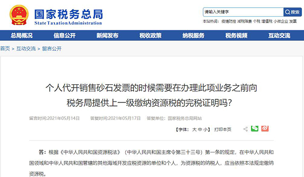 | 個(gè)人代開(kāi)銷(xiāo)售砂石發(fā)票的時(shí)候需要在辦理此項(xiàng)業(yè)務(wù)之前向稅務(wù)局提供上一級(jí)繳納資源稅的完稅證明嗎? 答:根據(jù)《中華人民共和國(guó)資源稅法》(中華人民共和國(guó)主席令第三十三號(hào))第一條的規(guī)定,在中華人民共和國(guó)領(lǐng)域和中華人民共和國(guó)管轄的其他海域開(kāi)發(fā)應(yīng)稅資源的單位和個(gè)人,為資源稅的納稅人,應(yīng)當(dāng)依照本法規(guī)定繳納資源稅。 根據(jù)《國(guó)家稅務(wù)總局關(guān)于公布取消一批稅務(wù)證明事項(xiàng)以及廢止和修改部分規(guī)章規(guī)范性文件的決定》(國(guó)家稅務(wù)總局令第48號(hào))廢止了《中華人民共和國(guó)資源稅代扣代繳管理辦法》(國(guó)稅發(fā)〔1998〕49號(hào)文件印發(fā),國(guó)家稅務(wù)總局令第44號(hào)修改),該文件的解讀闡述:取消“資源稅管理證明”后,實(shí)行納稅人自主申報(bào),不再采用代扣代繳的征管方式。 根據(jù)《全國(guó)稅務(wù)機(jī)關(guān)納稅服務(wù)規(guī)范》規(guī)定,代開(kāi)增值稅普通發(fā)票辦理材料如下: 《代開(kāi)增值稅發(fā)票繳納稅款申報(bào)單》、若屬于自然人,提供身份證件原件及復(fù)印件(原件查驗(yàn)后退回),若屬于已辦理稅務(wù)登記的納稅人,提供加載統(tǒng)一社會(huì)信用代碼的營(yíng)業(yè)執(zhí)照(或稅務(wù)登記證、組織機(jī)構(gòu)代碼證等)原件(查驗(yàn)后退回)、經(jīng)辦人身份證件原件及復(fù)印件(原件查驗(yàn)后退回)。 上述回復(fù)僅供參考。 |