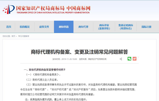 一、商標代理機構(gòu)備案需要哪些材料? (一)《商標代理機構(gòu)備案表》。 (二)商標代理從業(yè)人員名單。 (三)營業(yè)執(zhí)照或者律師事務所執(zhí)業(yè)許可證副本的復印件,并加蓋商標代理機構(gòu)章戳。營業(yè)執(zhí)照經(jīng)營范圍中應當含有“商標代理”、“知識產(chǎn)權(quán)代理”或“知識產(chǎn)權(quán)服務”項目。如果營業(yè)執(zhí)照未載明詳細經(jīng)營范圍,需同時提交公司經(jīng)營范圍的證明文件復印件并加蓋商標代理機構(gòu)章戳。 注:采用在線辦理方式的,需上傳上述文件的彩色掃描件。 二、商標代理機構(gòu)變更需要哪些材料? (一)《商標代理機構(gòu)變更備案表》。 (二)商標代理從業(yè)人員變更的,提交《商標代理從業(yè)人員變更表》。 (三)營業(yè)執(zhí)照或者律師事務所執(zhí)業(yè)許可證副本的復印件,并加蓋商標代理機構(gòu)章戳。如果變更商標代理機構(gòu)名稱,需同時提交登記主管部門變更核準文件復印件,并加蓋商標代理機構(gòu)章戳。 注:采用在線辦理方式的,需上傳上述文件的彩色掃描件。 三、商標代理機構(gòu)注銷需要哪些材料? (一)《商標代理機構(gòu)注銷備案/結(jié)算表》。 (二)登記主管部門出具的注銷登記通知書、公司變更登記通知書復印件,并加蓋商標代理機構(gòu)章戳。 (三)因停止辦理商標代理業(yè)務注銷備案的,需提交變更后的營業(yè)執(zhí)照或者律師事務所執(zhí)業(yè)許可證副本的復印件,并加蓋商標代理機構(gòu)章戳。如果變更后的營業(yè)執(zhí)照未載明詳細經(jīng)營范圍,需同時提交公司經(jīng)營范圍的證明文件復印件并加蓋商標代理機構(gòu)章戳。 四、商標代理機構(gòu)備案、變更的申請方式有哪些? 商標代理機構(gòu)備案、變更的申請方式有三種:在線辦理、郵寄辦理或直接辦理。 五、商標代理機構(gòu)注銷的申請方式有哪些? 商標代理機構(gòu)注銷的申請方式有兩種:郵寄辦理或直接辦理。 六、采用直接遞交的方式如何辦理? 如果采用直接遞交的方式,在國家知識產(chǎn)權(quán)局商標局商標注冊大廳專門受理窗口辦理。 七、如果采用郵寄辦理的方式如何辦理? 如果采用郵寄辦理的方式,相關(guān)文件材料寄送至北京市西城區(qū)茶馬南街1號中國商標大樓,收件人:收文科,郵政編碼:100055。 八、采用在線辦理的方式如何辦理? (一)新登記的商標代理機構(gòu)辦理備案業(yè)務,可通過“中國商標網(wǎng)>網(wǎng)上申請”欄目,點擊“我接受”進入網(wǎng)上服務系統(tǒng)首頁,點擊右側(cè)的“代理機構(gòu)備案申請”,在線辦理。 (二)已備案并領(lǐng)取數(shù)字證書的商標代理機構(gòu)辦理變更備案業(yè)務,可登錄網(wǎng)上服務系統(tǒng),在“代理申請業(yè)務”欄中選擇“代理變更申請”。 如果沒有數(shù)字證書,無法采用在線辦理的方式進行商標代理機構(gòu)變更備案。 九、在線辦理時出現(xiàn)收不到驗證碼的問題,如何解決? 在線辦理如果出現(xiàn)收不到驗證碼的問題,請嘗試按以下步驟解決: (一)查看向我局報送的電子郵箱是否填寫錯誤。 (二)查看電子郵箱的垃圾箱或草稿箱中是否有我局發(fā)送驗證碼的郵件。 (三)盡量選擇網(wǎng)易、新浪或QQ等常用郵箱作為接收郵件的電子郵箱。 (四)驗證碼有效期為30分鐘,請耐心等待,不要在此期間反復點擊“獲取驗證碼”的按鈕。 十、商標代理機構(gòu)如何查詢備案、變更、注銷結(jié)果? 商標代理機構(gòu)提交的代理備案及代理變更經(jīng)我局審查后,代理機構(gòu)可以通過電子郵箱查詢備案、變更結(jié)果。如果備案、變更、注銷成功,也可以在中國商標網(wǎng)上查詢到相關(guān)信息。 十一、商標代理機構(gòu)備案后如何通過網(wǎng)上申請的方式開展代理業(yè)務? 新成立的商標代理機構(gòu)備案后如果要通過網(wǎng)上申請的方式開展商標代理業(yè)務,須申請并領(lǐng)取數(shù)字證書后,方可通過網(wǎng)申開展業(yè)務。 十二、數(shù)字證書和網(wǎng)上申請的咨詢電話是多少? 有關(guān)數(shù)字證書和網(wǎng)上申請的問題,請打技術(shù)咨詢電話63218500轉(zhuǎn)3技術(shù)咨詢。 十三、商標代理機構(gòu)備案所需書式在哪里下載? 商標代理機構(gòu)可在中國商標網(wǎng)“商標代理”欄目下載所需書式。 十四、在線辦理商標代理機構(gòu)備案業(yè)務對電腦有何要求? 建議在瀏覽器使用IE9.0及以上版本(支持IE8.0),屏幕分辨率1280*768及以上的電腦環(huán)境下訪問。 十五、商標代理機構(gòu)備案的工作時限是多長時間? 國家知識產(chǎn)權(quán)局自收到備案材料之日起十五個工作日內(nèi)對商標代理機構(gòu)備案材料進行審核。 十六、商標代理機構(gòu)備案的辦理費用是多少? 商標代理機構(gòu)備案無須繳納費用。 十七、如何填寫商標代理機構(gòu)備案表中“身份證明文件編號”欄? 身份證明文件編號應當與所附主體資格證明文件中證件編號一致,即應填寫統(tǒng)一社會信用代碼。 十八、如何填寫商標代理機構(gòu)備案表中“負責人”欄? 負責人應當與所附主體資格證明文件中的“法定代表人”或“負責人”一致。 十九、報文清單是什么?如何填寫? 《商標代理機構(gòu)報送商標申請事項清單》并非申請文件,僅用于核對收文文件數(shù)量(件數(shù))。商