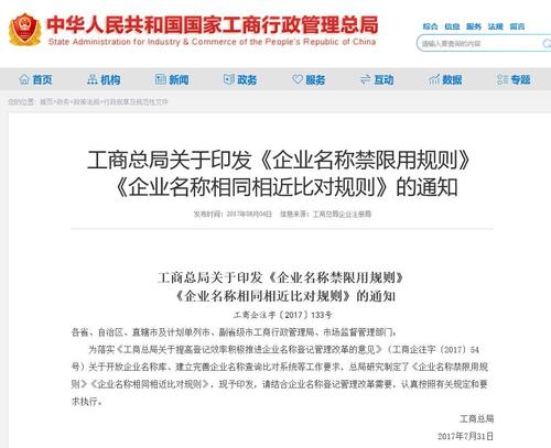 《企業(yè)名稱禁限用規(guī)則》 第一章 總則 第一條為規(guī)范企業(yè)名稱審核行為,建立、完善企業(yè)名稱比對系統(tǒng),為申請人提供更加便利的企業(yè)名稱登記、核準(zhǔn)服務(wù),根據(jù)《公司法》《企業(yè)法人登記管理條例》《公司登記管理條例》《企業(yè)名稱登記管理規(guī)定》《企業(yè)名稱登記管理實施辦法》和工商總局有關(guān)規(guī)范性文件等制定本規(guī)則。 第二條本規(guī)則適用于企業(yè)名稱登記、核準(zhǔn)有關(guān)業(yè)務(wù)。企業(yè)名稱審核人員依據(jù)本規(guī)則對企業(yè)名稱申請是否存在有關(guān)禁限用內(nèi)容進行審查,按照有關(guān)規(guī)定作出核準(zhǔn)或者駁回的決定。 第三條企業(yè)登記機關(guān)可以依據(jù)本規(guī)則建立、完善企業(yè)名稱比對系統(tǒng),為申請人提供企業(yè)名稱篩查服務(wù)。企業(yè)名稱自主申報改革試點地區(qū)可以參照本規(guī)則,建立、完善比對、申報系統(tǒng),為申請人提供自主申報、自負其責(zé)的登記服務(wù)。 第二章 禁止性規(guī)則 第四條 企業(yè)名稱不得與同一企業(yè)登記機關(guān)已登記注冊、核準(zhǔn)的同行業(yè)企業(yè)名稱相同。 以下情形適用于本條款規(guī)定: (一)與同一登記機關(guān)已登記、或者已核準(zhǔn)但尚未登記且仍在有效期內(nèi)、或者已申請尚未核準(zhǔn)的同行業(yè)企業(yè)名稱相同; (二)與辦理注銷登記未滿1年的同行業(yè)企業(yè)名稱相同; (三)與同一登記機關(guān)企業(yè)變更名稱未滿1年的原同行業(yè)名稱相同; (四)與被撤銷設(shè)立登記和被吊銷營業(yè)執(zhí)照尚未辦理注銷登記的同行業(yè)企業(yè)名稱相同。 第五條 企業(yè)名稱不得含有有損于國家、社會公共利益的內(nèi)容和文字。 以下情形適用于本條款規(guī)定: (一)有消極或不良政治影響的。如“支那”“黑太陽”“大地主”等。 (二)宣揚恐怖主義、分裂主義和極端主義的。如“九一一”“東突”“占中”等。 (三)帶有 殖民文化色彩,有損民族尊嚴(yán)和傷害人民感情的。如“大東亞”“大和”“ 福爾摩薩”等。 (四)帶有種族、民族、性別等歧視傾向的。如“黑鬼”等。 (五)含有封建文化糟粕、違背社會良好風(fēng)尚或不尊重民族風(fēng)俗習(xí)慣的。如“鬼都”“妻妾成群”等。 (六)涉及毒品、淫穢、色情、暴力、賭博的。如“海洛因”“推牌九”等。 第六條 企業(yè)名稱不得含有可能對公眾造成欺騙或者誤解的內(nèi)容和文字。 以下情形適用于本條款規(guī)定: (一)含有黨和國家領(lǐng)導(dǎo)人、老一輩革命家、知名烈士和知名模范的姓名的。如“董存瑞”“雷鋒”等。 (二)含有非法組織名稱或者反動政治人物、公眾熟知的反面人物的姓名的。如“汪精衛(wèi)”“秦檜”等。 (三)含有宗教組織名稱或帶有顯著宗教色彩的。如“基督教”“佛教”“伊斯蘭教”等。 第七條 企業(yè)名稱不得含有外國國家(地區(qū))名稱、國際組織名稱。 第八條 企業(yè)名稱不得含有政黨名稱、黨政軍機關(guān)名稱、群團組織名稱、社會組織名稱及部隊番號。 第九條 企業(yè)名稱應(yīng)當(dāng)使用符合國家規(guī)范的漢字,不得使用外文、字母和阿拉伯?dāng)?shù)字。 第十條 企業(yè)名稱不得含有其他法律、 行政法規(guī)規(guī)定禁止的內(nèi)容和文字。第十一條企業(yè)名稱應(yīng)當(dāng)由行政區(qū)劃、字號、行業(yè)、組織形式依次組成。企業(yè)名稱中的行政區(qū)劃是本企業(yè)所在地縣級以上行政區(qū)劃的名稱或地名。 市轄區(qū)的名稱不能單獨用作企業(yè)名稱中的行政區(qū)劃。 第十二條 企業(yè)名稱中的字號應(yīng)當(dāng)由2個以上的符合國家規(guī)范的漢字組成,行政區(qū)劃、行業(yè)、組織形式不得用作字號。 第十三條企業(yè)應(yīng)當(dāng)根據(jù)其主營業(yè)務(wù),依照國家行業(yè)分類標(biāo)準(zhǔn)劃分的類別,在企業(yè)名稱中標(biāo)明所屬行業(yè)或者經(jīng)營特點。國家法律、法規(guī)以及國務(wù)院決定等對企業(yè)名稱中的行業(yè)有特殊要求的,應(yīng)當(dāng)在企業(yè)名稱中標(biāo)明。不得在企業(yè)名稱中標(biāo)示國家法律、法規(guī)以及國務(wù)院決定等禁止經(jīng)營的行業(yè)。 第十四條企業(yè)應(yīng)當(dāng)根據(jù)其組織結(jié)構(gòu)或者責(zé)任形式在名稱中標(biāo)明符合國家法律、法規(guī)以及國務(wù)院決定規(guī)定的組織形式,不得使用與其組織結(jié)構(gòu)或者責(zé)任形式不一致的組織形式。 第三章 限制性規(guī)則 第十五條 企業(yè)名稱不得與同一企業(yè)登記機關(guān)已登記注冊、核準(zhǔn)的同行業(yè)企業(yè)名稱近似,但有投資關(guān)系的除外。 第十六條 企業(yè)法人名稱中不得含有其 他非營利法人的名稱,但有投資關(guān)系或者經(jīng)該法人授權(quán),且使用該法人簡稱或者特定稱謂的除外。該法人的簡稱或者特定稱謂有其他含義或者指向不確定的,可以不經(jīng)授權(quán)。 第十七條企業(yè)名稱中不得含有另一個企業(yè)名稱,但有投資關(guān)系或者經(jīng)該企業(yè)授權(quán),且使用該企業(yè)的簡稱或者特定稱謂的除外。該企業(yè)的簡稱或者特定稱謂有其他含義或者指向不確定的,可以不經(jīng)授