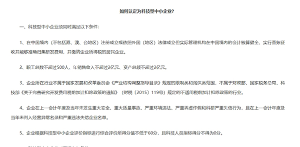 科技型中小企業(yè)評價(jià)辦法 第一章總則 第一條為貫徹落實(shí)《國家創(chuàng)新驅(qū)動發(fā)展戰(zhàn)略綱要》,推動大眾創(chuàng)業(yè)萬眾創(chuàng)新,加速科技成果產(chǎn)業(yè)化,加大對科技型中小企業(yè)的精準(zhǔn)支持力度,壯大科技型中小企業(yè)群體,培育新的經(jīng)濟(jì)增長點(diǎn),根據(jù)《深化科技體制改革實(shí)施方案》要求,制定本辦法。 第二條本辦法所稱的科技型中小企業(yè)是指依托一定數(shù)量的科技人員從事科學(xué)技術(shù)研究開發(fā)活動,取得自主知識產(chǎn)權(quán)并將其轉(zhuǎn)化為高新技術(shù)產(chǎn)品或服務(wù),從而實(shí)現(xiàn)可持續(xù)發(fā)展的中小企業(yè)。 第三條科技型中小企業(yè)評價(jià)工作采取企業(yè)自主評價(jià)、省級科技管理部門組織實(shí)施、科技部服務(wù)監(jiān)督的工作模式,堅(jiān)持服務(wù)引領(lǐng)、放管結(jié)合、公開透明的原則。 第四條科技部負(fù)責(zé)建設(shè)“全國科技型中小企業(yè)信息服務(wù)平臺”(以下簡稱“服務(wù)平臺”)和“全國科技型中小企業(yè)信息庫”(以下簡稱“信息庫”)。科技部火炬高技術(shù)產(chǎn)業(yè)開發(fā)中心負(fù)責(zé)服務(wù)平臺和信息庫建設(shè)與運(yùn)行的日常工作。 企業(yè)可根據(jù)本辦法進(jìn)行自主評價(jià),并按照自愿原則到服務(wù)平臺填報(bào)企業(yè)信息,經(jīng)公示無異議的,納入信息庫。 第五條各有關(guān)部門和各級人民政府應(yīng)當(dāng)對納入信息庫的科技型中小企業(yè)提供精準(zhǔn)支持和精準(zhǔn)服務(wù),制定的支持企業(yè)技術(shù)創(chuàng)新的政策措施應(yīng)優(yōu)先支持納入信息庫的企業(yè)。 第二章評價(jià)指標(biāo) 第六條科技型中小企業(yè)須同時滿足以下條件: (一)在中國境內(nèi)(不包括港、澳、臺地區(qū))注冊的居民企業(yè)。 (二)職工總數(shù)不超過500人、年銷售收入不超過2億元、資產(chǎn)總額不超過2億元。 (三)企業(yè)提供的產(chǎn)品和服務(wù)不屬于國家規(guī)定的禁止、限制和淘汰類。 (四)企業(yè)在填報(bào)上一年及當(dāng)年內(nèi)未發(fā)生重大安全、重大質(zhì)量事故和嚴(yán)重環(huán)境違法、科研嚴(yán)重失信行為,且企業(yè)未列入經(jīng)營異常名錄和嚴(yán)重違法失信企業(yè)名單。 (五)企業(yè)根據(jù)科技型中小企業(yè)評價(jià)指標(biāo)進(jìn)行綜合評價(jià)所得分值不低于60分,且科技人員指標(biāo)得分不得為0分。 第七條科技型中小企業(yè)評價(jià)指標(biāo)具體包括科技人員、研發(fā)投入、科技成果三類,滿分100分。 1.科技人員指標(biāo)(滿分20分)。按科技人員數(shù)占企業(yè)職工總數(shù)的比例分檔評價(jià)。 A.30%(含)以上(20分) B.25%(含)-30%(16分) C.20%(含)-25%(12分) D.15%(含)-20%(8分) E.10%(含)-15%(4分) F.10%以下(0分) 2.研發(fā)投入指標(biāo)(滿分50分)。企業(yè)從(1)、(2)兩項(xiàng)指標(biāo)中選擇一個指標(biāo)進(jìn)行評分。 (1)按企業(yè)研發(fā)費(fèi)用總額占銷售收入總額的比例分檔評價(jià)。 A.6%(含)以上(50分) B.5%(含)-6%(40分) C.4%(含)-5%(30分) D.3%(含)-4%(20分) E.2%(含)-3%(10分) F.2%以下(0分) (2)按企業(yè)研發(fā)費(fèi)用總額占成本費(fèi)用支出總額的比例分檔評價(jià)。 A.30%(含)以上(50分) B.25%(含)-30%(40分) C.20%(含)-25%(30分) D.15%(含)-20%(20分) E.10%(含)-15%(10分) F.10%以下(0分) 3.科技成果指標(biāo)(滿分30分)。按企業(yè)擁有的在有效期內(nèi)的與主要產(chǎn)品(或服務(wù))相關(guān)的知識產(chǎn)權(quán)類別和數(shù)量(知識產(chǎn)權(quán)應(yīng)沒有爭議或糾紛)分檔評價(jià)。 A.1項(xiàng)及以上Ⅰ類知識產(chǎn)權(quán)(30分) B.4項(xiàng)及以上Ⅱ類知識產(chǎn)權(quán)(24分) C.3項(xiàng)Ⅱ類知識產(chǎn)權(quán)(18分) D.2項(xiàng)Ⅱ類知識產(chǎn)權(quán)(12分) E.1項(xiàng)Ⅱ類知識產(chǎn)權(quán)(6分) F.沒有知識產(chǎn)權(quán)(0分) 第八條符合第六條第(一)~(四)項(xiàng)條件的企業(yè),若同時符合下列條件中的一項(xiàng),則可直接確認(rèn)符合科技型中小企業(yè)條件: (一)企業(yè)擁有有效期內(nèi)高新技術(shù)企業(yè)資格證書; (二)企業(yè)近五年內(nèi)獲得過國家級科技獎勵,并在獲獎單位中排在前三名; (三)企業(yè)擁有經(jīng)認(rèn)定的省部級以上研發(fā)機(jī)構(gòu); (四)企業(yè)近五年內(nèi)主導(dǎo)制定過國際標(biāo)準(zhǔn)、國家標(biāo)準(zhǔn)或行業(yè)標(biāo)準(zhǔn)。 第九條科技型中小企業(yè)評價(jià)指標(biāo)的說明: (一)企業(yè)科技人員是指企業(yè)直接從事研發(fā)和相關(guān)技術(shù)創(chuàng)新活動,以及專門從事上述活動管理和提供直接服務(wù)的人員,包括在職、兼職和臨時聘用人員,兼職、臨時聘用人員全年須在企業(yè)累計(jì)工作6個月以上。 (二)企業(yè)職工總數(shù)包括企業(yè)在職、兼職和臨時聘用人員。在職人員通過企業(yè)是否簽訂了勞動合同或繳納社會保險(xiǎn)費(fèi)來鑒別,兼職、臨時聘用人員全年須在企業(yè)累計(jì)工作6個月以上。 (三)企業(yè)研發(fā)費(fèi)用是指企業(yè)研發(fā)活動中發(fā)生的相關(guān)費(fèi)用,具體按照財(cái)政部國家稅務(wù)總局科技部《關(guān)于完善研究開發(fā)費(fèi)用稅前加計(jì)扣除政策的通知》(財