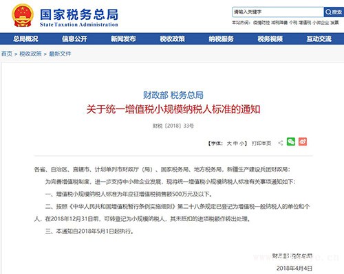 各省、自治區(qū)、直轄市、計(jì)劃單列市財(cái)政廳(局)、國家稅務(wù)局、地方稅務(wù)局,新疆生產(chǎn)建設(shè)兵團(tuán)財(cái)政局: 為完善增值稅制度,進(jìn)一步支持中小微企業(yè)發(fā)展,現(xiàn)將統(tǒng)一增值稅小規(guī)模納稅人標(biāo)準(zhǔn)有關(guān)事項(xiàng)通知如下: 一、增值稅小規(guī)模納稅人標(biāo)準(zhǔn)為年應(yīng)征增值稅銷售額500萬元及以下。 二、按照《中華人民共和國增值稅暫行條例實(shí)施細(xì)則》第二十八條規(guī)定已登記為增值稅一般納稅人的單位和個(gè)人,在2018年12月31日前,可轉(zhuǎn)登記為小規(guī)模納稅人,其未抵扣的進(jìn)項(xiàng)稅額作轉(zhuǎn)出處理。 三、本通知自2018年5月1日起執(zhí)行。 財(cái)政部 稅務(wù)總局 2018年4月4日 |
