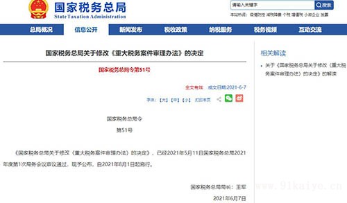 重大稅務(wù)案件審理辦法 (2014年12月2日國(guó)家稅務(wù)總局令第34號(hào)公布,根據(jù)2021年6月7日國(guó)家稅務(wù)總局令第51號(hào)修正) 第一章 總則 第一條 為貫徹落實(shí)中共中央辦公廳、國(guó)務(wù)院辦公廳印發(fā)的《關(guān)于進(jìn)一步深化稅收征管改革的意見》,推進(jìn)稅務(wù)機(jī)關(guān)科學(xué)民主決策,強(qiáng)化內(nèi)部權(quán)力制約,優(yōu)化稅務(wù)執(zhí)法方式,嚴(yán)格規(guī)范執(zhí)法行為,推進(jìn)科學(xué)精確執(zhí)法,保護(hù)納稅人繳費(fèi)人等稅務(wù)行政相對(duì)人合法權(quán)益,根據(jù)《中華人民共和國(guó)行政處罰法》《中華人民共和國(guó)稅收征收管理法》,制定本辦法。 第二條 省以下各級(jí)稅務(wù)局開展重大稅務(wù)案件審理工作適用本辦法。 第三條 重大稅務(wù)案件審理應(yīng)當(dāng)以事實(shí)為根據(jù)、以法律為準(zhǔn)繩,遵循合法、合理、公平、公正、效率的原則,注重法律效果和社會(huì)效果相統(tǒng)一。 第四條 參與重大稅務(wù)案件審理的人員應(yīng)當(dāng)嚴(yán)格遵守國(guó)家保密規(guī)定和工作紀(jì)律,依法為納稅人繳費(fèi)人等稅務(wù)行政相對(duì)人的商業(yè)秘密、個(gè)人隱私和個(gè)人信息保密。 第二章 審理機(jī)構(gòu)和職責(zé) 第五條 省以下各級(jí)稅務(wù)局設(shè)立重大稅務(wù)案件審理委員會(huì)(以下簡(jiǎn)稱審理委員會(huì))。 審理委員會(huì)由主任、副主任和成員單位組成,實(shí)行主任負(fù)責(zé)制。 審理委員會(huì)主任由稅務(wù)局局長(zhǎng)擔(dān)任,副主任由稅務(wù)局其他領(lǐng)導(dǎo)擔(dān)任。審理委員會(huì)成員單位包括政策法規(guī)、稅政業(yè)務(wù)、納稅服務(wù)、征管科技、大企業(yè)稅收管理、稅務(wù)稽查、督察內(nèi)審部門。各級(jí)稅務(wù)局可以根據(jù)實(shí)際需要,增加其他與案件審理有關(guān)的部門作為成員單位。 第六條 審理委員會(huì)履行下列職責(zé): (一)擬定本機(jī)關(guān)審理委員會(huì)工作規(guī)程、議事規(guī)則等制度; (二)審理重大稅務(wù)案件; (三)指導(dǎo)監(jiān)督下級(jí)稅務(wù)局重大稅務(wù)案件審理工作。 第七條 審理委員會(huì)下設(shè)辦公室,辦公室設(shè)在政策法規(guī)部門,辦公室主任由政策法規(guī)部門負(fù)責(zé)人兼任。 第八條審理委員會(huì)辦公室履行下列職責(zé): (一)組織實(shí)施重大稅務(wù)案件審理工作; (二)提出初審意見; (三)制作審理會(huì)議紀(jì)要和審理意見書; (四)辦理重大稅務(wù)案件審理工作的統(tǒng)計(jì)、報(bào)告、案卷歸檔; (五)承擔(dān)審理委員會(huì)交辦的其他工作。 第九條 審理委員會(huì)成員單位根據(jù)部門職責(zé)參加案件審理,提出審理意見。 稽查局負(fù)責(zé)提交重大稅務(wù)案件證據(jù)材料、擬作稅務(wù)處理處罰意見、舉行聽證。 稽查局對(duì)其提交的案件材料的真實(shí)性、合法性、準(zhǔn)確性負(fù)責(zé)。 第十條 參與重大稅務(wù)案件審理的人員有法律法規(guī)規(guī)定的回避情形的,應(yīng)當(dāng)回避。 重大稅務(wù)案件審理參與人員的回避,由其所在部門的負(fù)責(zé)人決定;審理委員會(huì)成員單位負(fù)責(zé)人的回避,由審理委員會(huì)主任或其授權(quán)的副主任決定。 第三章 審理范圍 第十一條 本辦法所稱重大稅務(wù)案件包括: (一)重大稅務(wù)行政處罰案件,具體標(biāo)準(zhǔn)由各省、自治區(qū)、直轄市和計(jì)劃單列市稅務(wù)局根據(jù)本地情況自行制定,報(bào)國(guó)家稅務(wù)總局備案; (二)根據(jù)《重大稅收違法案件督辦管理暫行辦法》督辦的案件; (三)應(yīng)監(jiān)察、司法機(jī)關(guān)要求出具認(rèn)定意見的案件; (四)擬移送公安機(jī)關(guān)處理的案件; (五)審理委員會(huì)成員單位認(rèn)為案情重大、復(fù)雜,需要審理的案件; (六)其他需要審理委員會(huì)審理的案件。 有下列情形之一的案件,不屬于重大稅務(wù)案件審理范圍: (一)公安機(jī)關(guān)已就稅收違法行為立案的; (二)公安機(jī)關(guān)尚未就稅收違法行為立案,但被查對(duì)象為走逃(失聯(lián))企業(yè),并且涉嫌犯罪的; (三)國(guó)家稅務(wù)總局規(guī)定的其他情形。 第十二條 本辦法第十一條第一款第三項(xiàng)規(guī)定的案件經(jīng)審理委員會(huì)審理后,應(yīng)當(dāng)將擬處理意見報(bào)上一級(jí)稅務(wù)局審理委員會(huì)備案。備案5日后可以作出決定。 第十三條 稽查局應(yīng)當(dāng)在每季度終了后5日內(nèi)將稽查案件審理情況備案表送審理委員會(huì)辦公室備案。 第四章 提請(qǐng)和受理 第十四條 稽查局應(yīng)當(dāng)在內(nèi)部審理程序終結(jié)后5日內(nèi),將重大稅務(wù)案件提請(qǐng)審理委員會(huì)審理。 當(dāng)事人按照法律、法規(guī)、規(guī)章有關(guān)規(guī)定要求聽證的,由稽查局組織聽證。 第十五條 稽查局提請(qǐng)審理委員會(huì)審理案件,應(yīng)當(dāng)提交以下案件材料: (一)重大稅務(wù)案件審理案卷交接單; (二)重大稅務(wù)案件審理提請(qǐng)書; (三)稅務(wù)稽查報(bào)告; (四)稅務(wù)稽查審理報(bào)告; (五)聽證材料; (六)相關(guān)證據(jù)材料。 重大稅務(wù)案件審理提請(qǐng)書應(yīng)當(dāng)寫明擬處理意見,